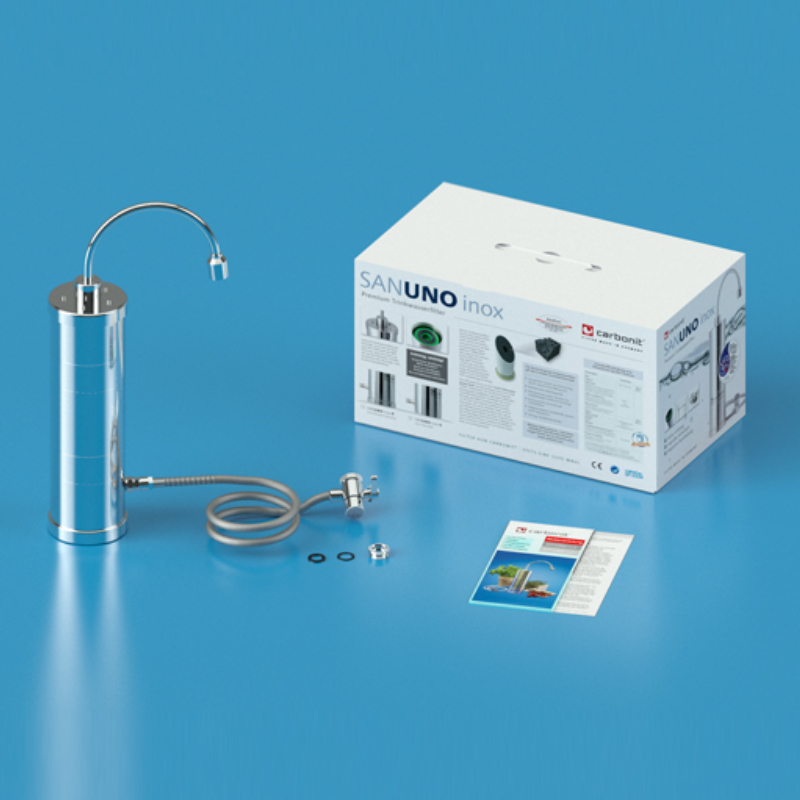 Asztali készülék CARBONIT patronnal a normál csap (konyhai csaptelep) kifolyójához való csatlakoztatáshoz. Speciális kapcsolószeleppel és adapterrel a belső menetekhez. Azaz a konyhai felhasználási pont szerinti szűrés. Ha a váltószelep karját működtetik, a csapvíz átfolyik a szűrőn, és a szűrő külön kimenetén távozik elszívásra.