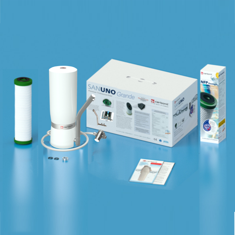 Asztali készülék patronnal a normál csaphoz való csatlakoztatáshoz. Váltószeleppel és adapterrel a belső menetekhez. Helyi szűrés a konyhában.