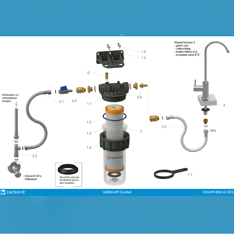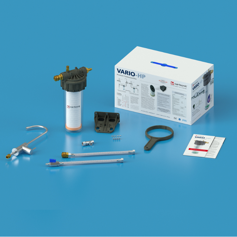 Komplett ház tömlőkkel, 3/8″ csavaros csatlakozással, T-idom, elzáró golyóscsap, 2 db rozsdamentes hajlékony tömlő, fali konzol, tömítések, csap készlet 8, CARBONIT IFP Puro szűrőbetét, használati útmutató, csomagolva masszív kartondobozban hordszíjjal és nyomtatott borítóval.
