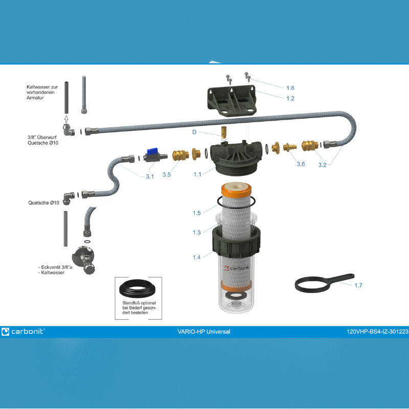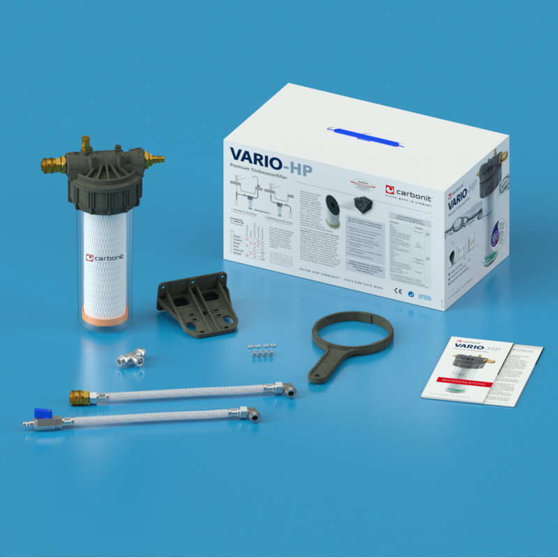 Komplett ház gyorscsatlakozókkal a szűrőházon, elzáró golyóscsappal, 2 db rozsdamentes acél rugalmas tömlővel, csavaros csatlakozással, fali konzollal, tömítésekkel. Szűrőpatron: CARBONIT IFP Puro.